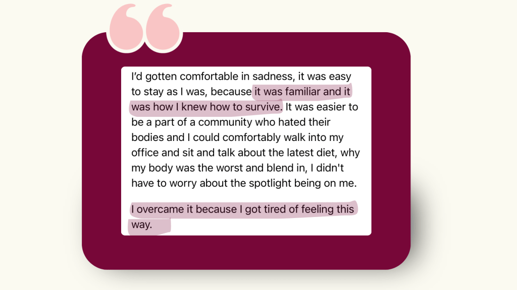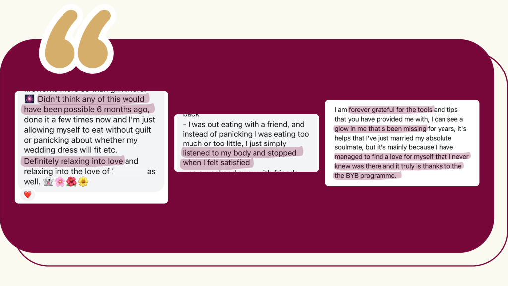 I began to question my beliefs about food & my body and I realised that not everyone lives with minds consumed of thoughts about food and their bodies(!). So, I set out on a journey to build a healthier relationship with myself. It lead me to learn the patterns that I was trapped inside of and now I feel a sense of confidence & freedom that I didn’t think existed! I’ve been able to relax into healthy love, knowing and believing it when he says I’m beautiful.